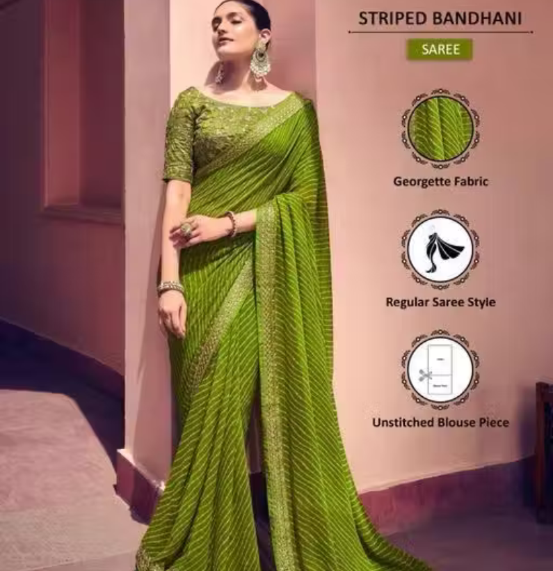 Bandhani Printed saree with Banarasi Lace Border and with unstitched blouse piece New Arrival Latest Georgette Printed Saree Fancy Women’s Designer Saree Trending Saree Bollywood Saree daily use saree, fancy saree, naye design of saree nai design of saree