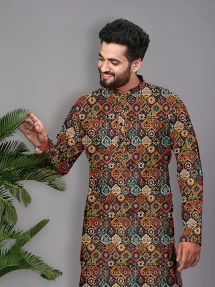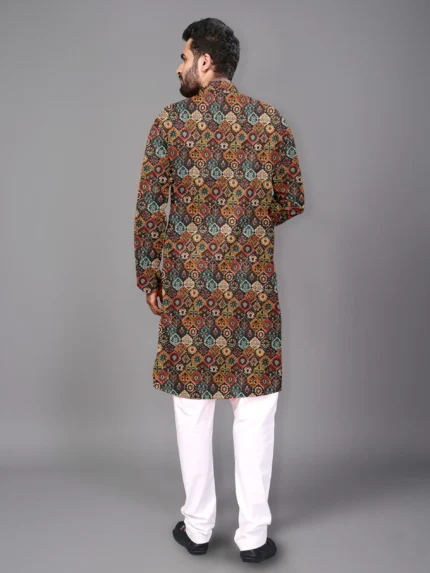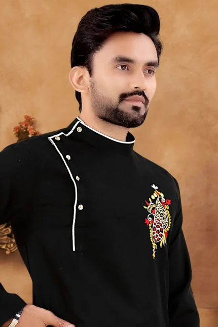 Highlights KUNJ CRAETION Color:Black Fabric:Cotton Blend Type:Kurta Pyjama Set Kurta Length:Knee Length Neck Shape:Mandarin Collar Lining Material:None Pattern:Embroidered Fit:Regular Fit