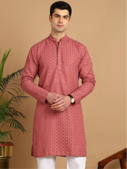 Highlights KUNJ CRAETION Color: Maroon Fabric:Cotton Blend Type:Kurta Pyjama Set Kurta Length:Knee Length Neck Shape:Mandarin Collar Lining Material:None Pattern:Embroidered Fit:Regular