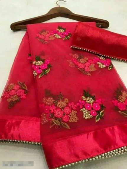HIFLI Net Embroidered Banarasi saree With Unstitched Blouse Piece ( Red )