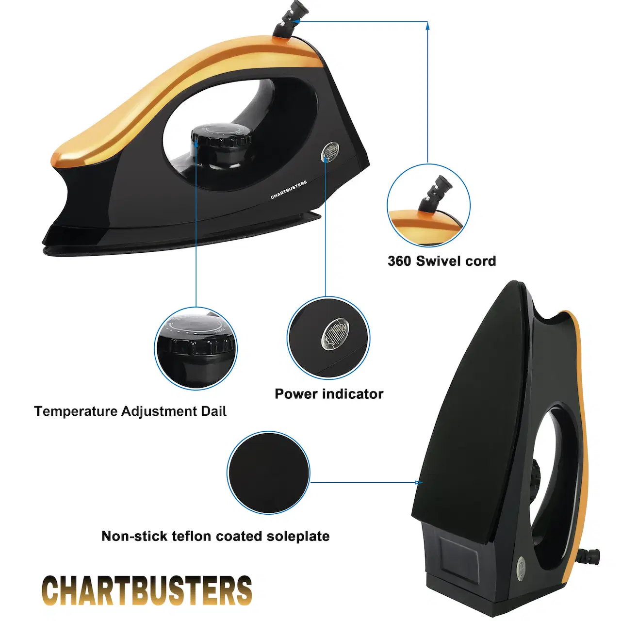 CHARTBUSTERS Keep your clothes looking new with this Non-stick Compact dry iron . Its Coating Plate ensures a smooth gliding experience while the well-designed grip handle ensures a secure and comfortable grip.
