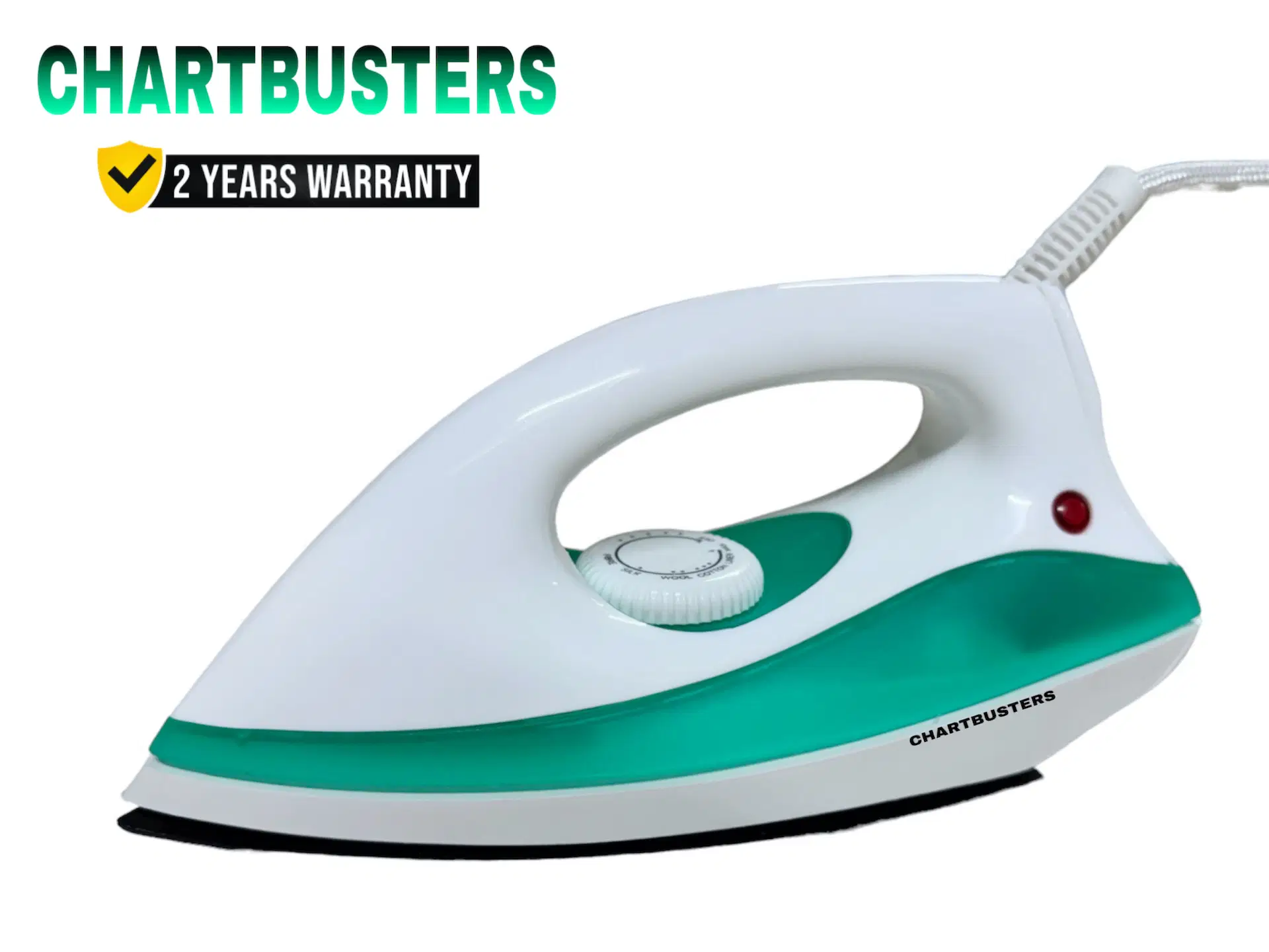 About this item NON-STICK SOLE PLATE: CHARTBUSTERS American Heritage sole plate coating that gives the iron non-stick operation, which makes it the best option in the dry iron press for clothes. BETTER HEAT CONDUCTIVITY: To ensure even heating, the electric iron has a silver-layered thermostat attached to it. FLEXIBILITY DURING USAGE: This user-friendly iron press allows you to iron clothes seamlessly as it is equipped with a 360-degree swivel cord with cotton braided thread. SUITABLE FOR MULTIPLE FABRIC TYPES: The Electric iron comes with adjustable temperature controllers that help you regulate the iron’s heating according to the fabric type. UNIFORM HEATING: The G-shaped element in the electric iron assists in uniform heating, making ironing smooth and hassle-free. SAFETY USAGE: The CHARTBUSTERS Iron is equipped with a thermal fuse and a high-temperature grade PBT insulator to prevent overheating.