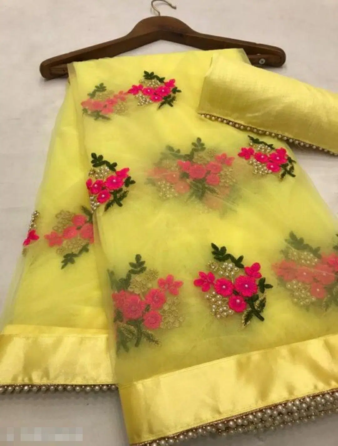 HIFLI Net Embroidered Banarasi saree With Unstitched Blouse Piece ( Yellow )