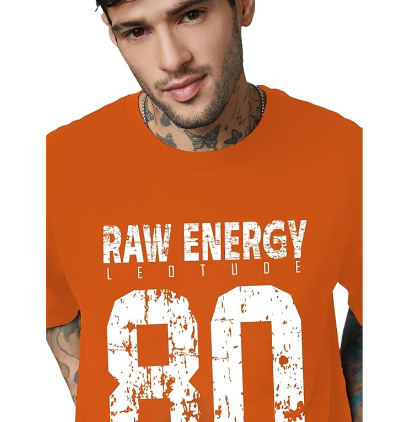 LEOTUDE Men Half Sleeve Round Neck Graphic Font Printed Cottonblend Oversized Tshirts (Colour: Orange)