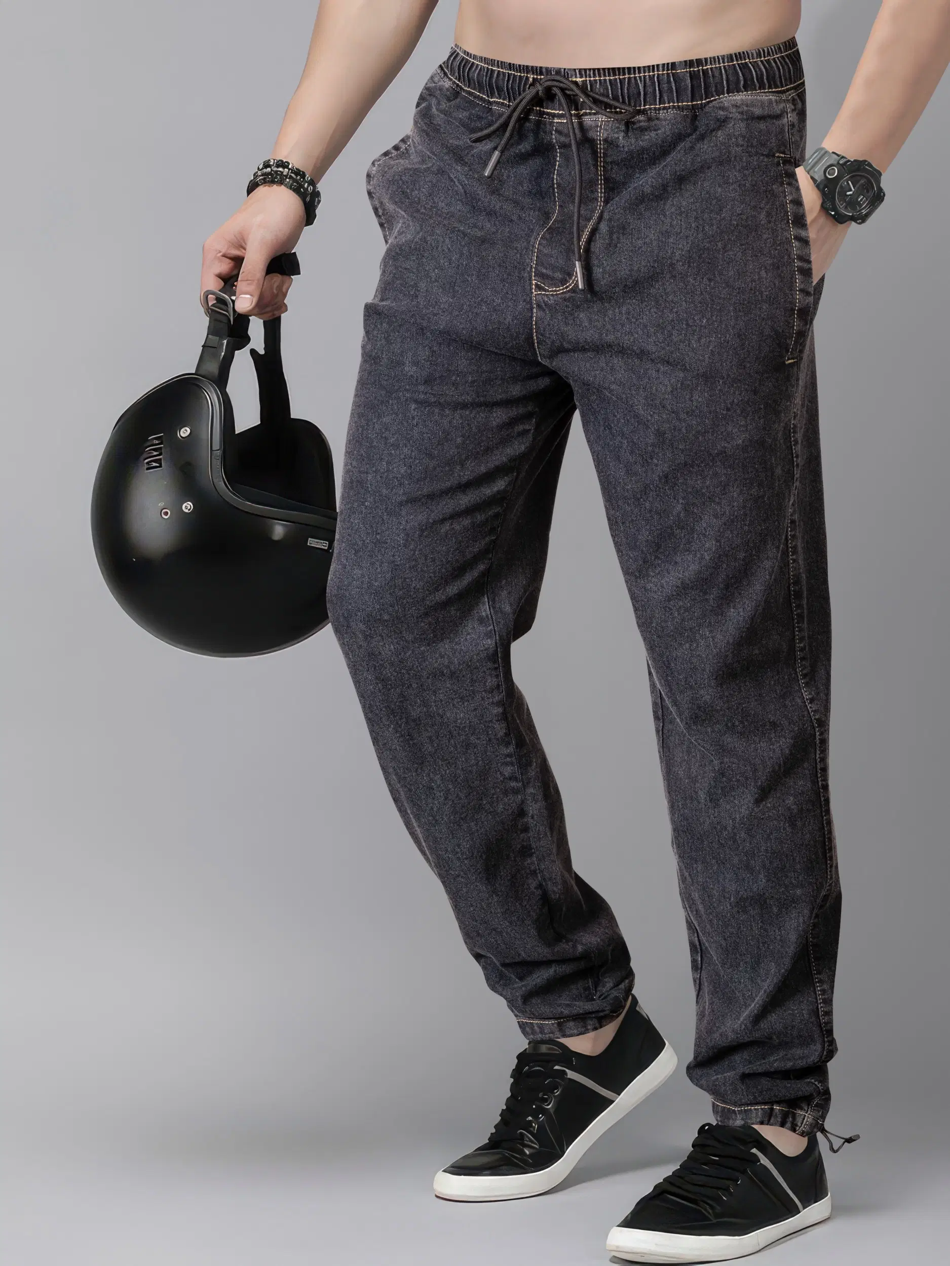 The tapered fit with elasticated cuffs ensures a smart, trendy look that pairs perfectly with sneakers or casual shoes. Made from durable and breathable denim, these jeans are ideal for everyday wear, travel, or streetwear styling.