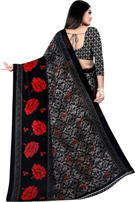 Highlights Vibhagyaa Fabric:Georgette Pattern:Printed Pattern or Print Type:Floral Set Contents:With Unstitched Blouse Piece Blouse Fabric:Georgette Saree Type:Regular Saree Color:Black Saree