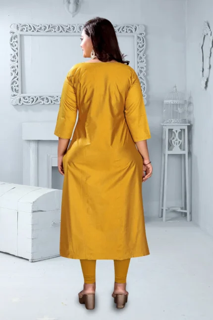 Highlights Style:Straight Fabric:Chanderi Product Length:Calf Length Color:Mustard Sleeves Type:Regular Sleeves Sleeves Length:3/4th Sleeves Pattern or Print Type:Thread Work Neck Shape:Round
